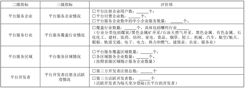 服務(wù)創(chuàng)新能力主要包括平臺(tái)服務(wù)企業(yè)情況、服務(wù)行業(yè)情況、服務(wù)區(qū)域情況、平臺(tái)開(kāi)發(fā)者社區(qū)、平臺(tái)注冊(cè)用戶五個(gè)方面的內(nèi)容,用于評(píng)價(jià)工業(yè)互聯(lián)網(wǎng)平臺(tái)賦能制造業(yè)數(shù)字化轉(zhuǎn)型的服務(wù)創(chuàng)新能力。