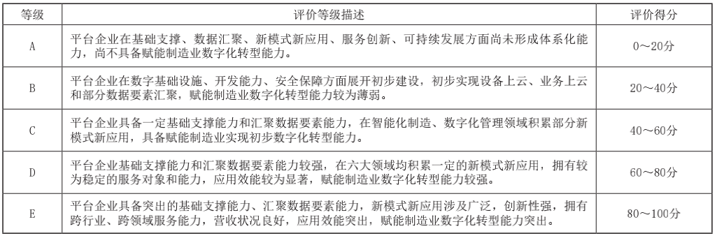 基于評(píng)價(jià)對(duì)象在工業(yè)互聯(lián)網(wǎng)平臺(tái)賦能制造業(yè)數(shù)字化轉(zhuǎn)型能力評(píng)價(jià)的總得分情況,結(jié)合基礎(chǔ)支撐、數(shù)據(jù)匯聚、新模式新應(yīng)用、服務(wù)創(chuàng)新、可持續(xù)發(fā)展五方面能力水平綜合得分情況,將評(píng)價(jià)對(duì)象賦能制造業(yè)數(shù)字化轉(zhuǎn)型能力劃分為5個(gè)等級(jí),各等級(jí)能力水平描述如下: