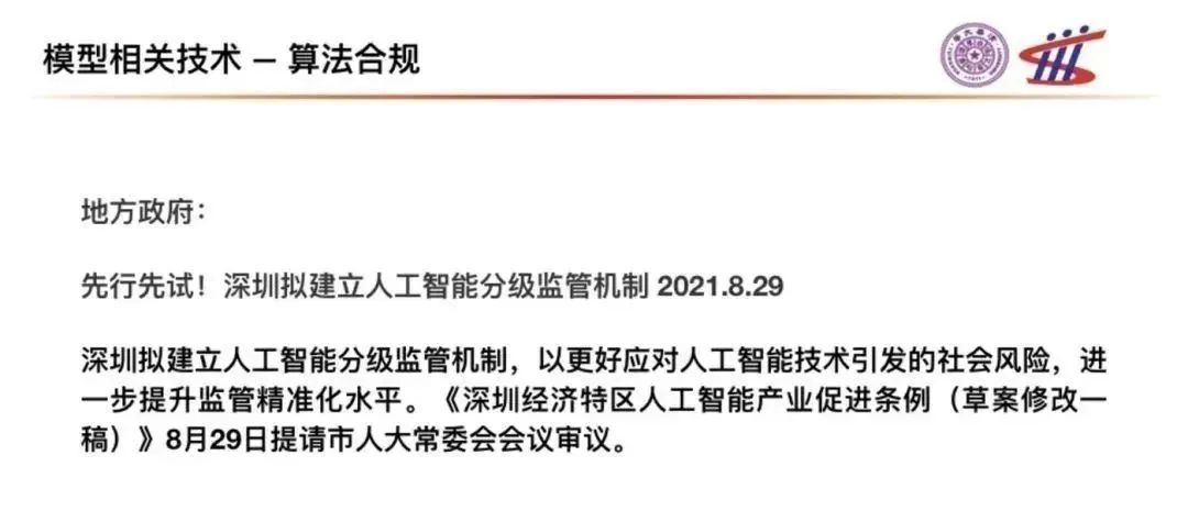 同時(shí)的,模型治理的另一面是算法的合規(guī)性。在數(shù)字經(jīng)濟(jì)時(shí)代,越來越多的生產(chǎn)活動需要依靠算法模型開展,算法與業(yè)務(wù)的深度融合會是未來的趨勢,對于業(yè)務(wù)的合規(guī)性要求也會傳導(dǎo)到對算法的合規(guī)性要求。在這方面,我們欣喜的看到深圳市已經(jīng)開始了先行先試,在今年8月份宣布擬建立人工智能分級監(jiān)管機(jī)制。