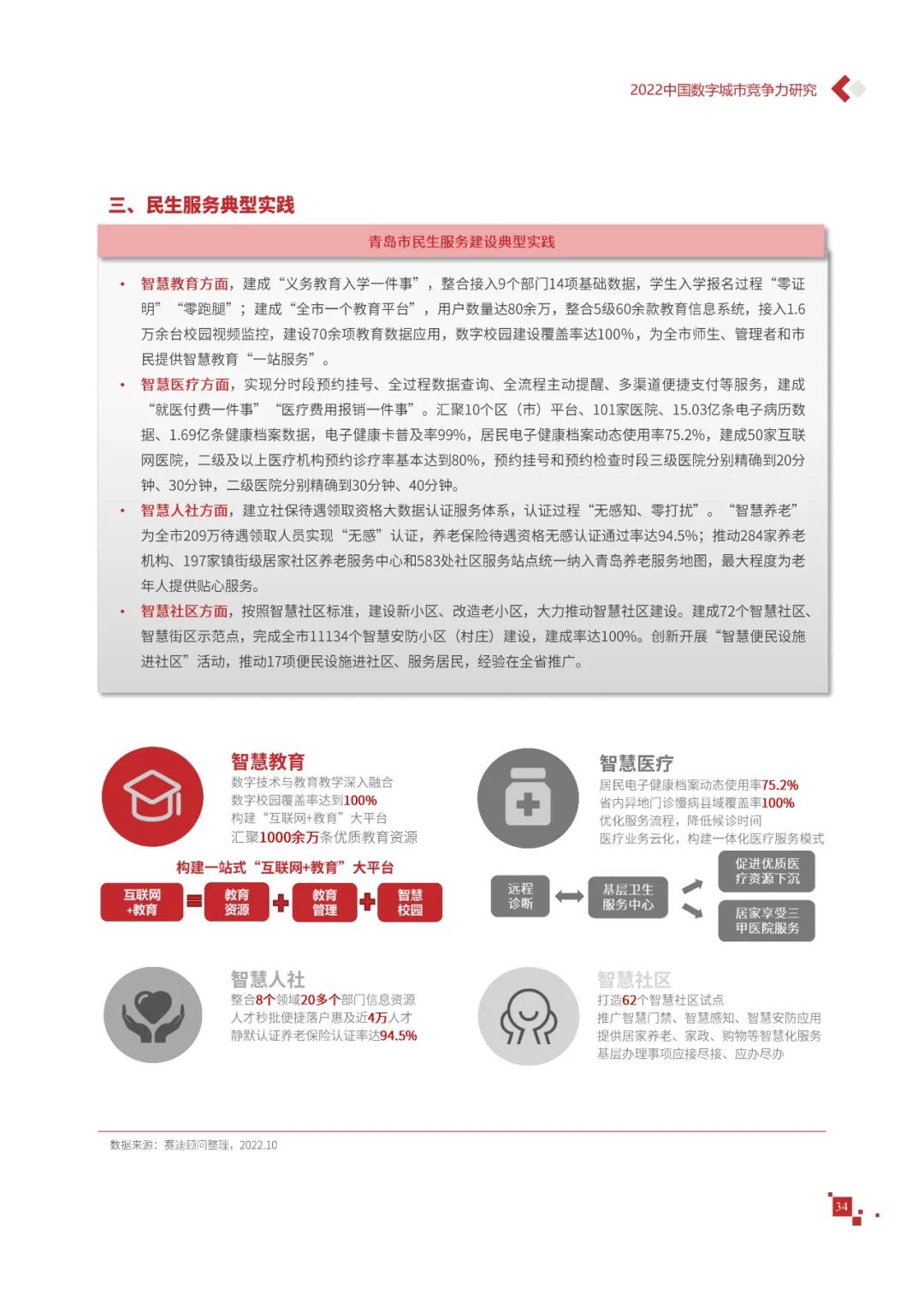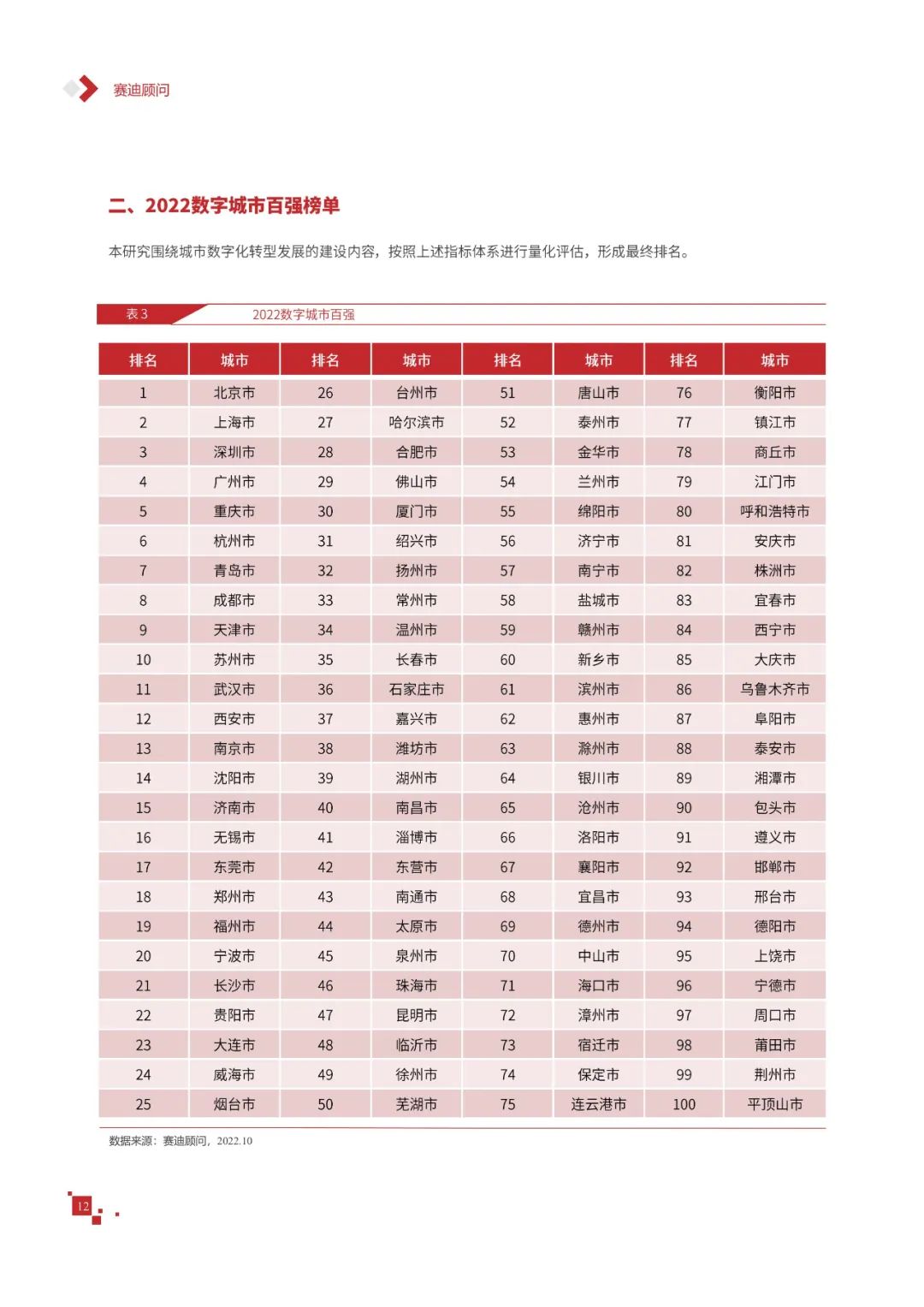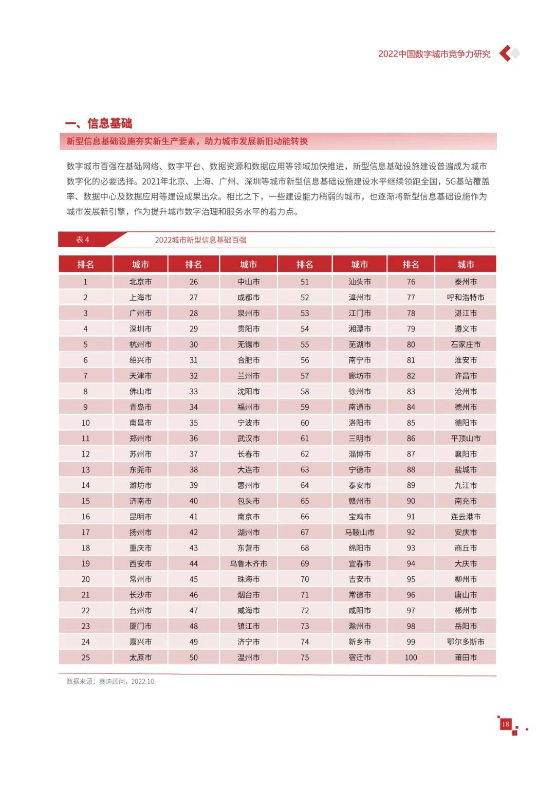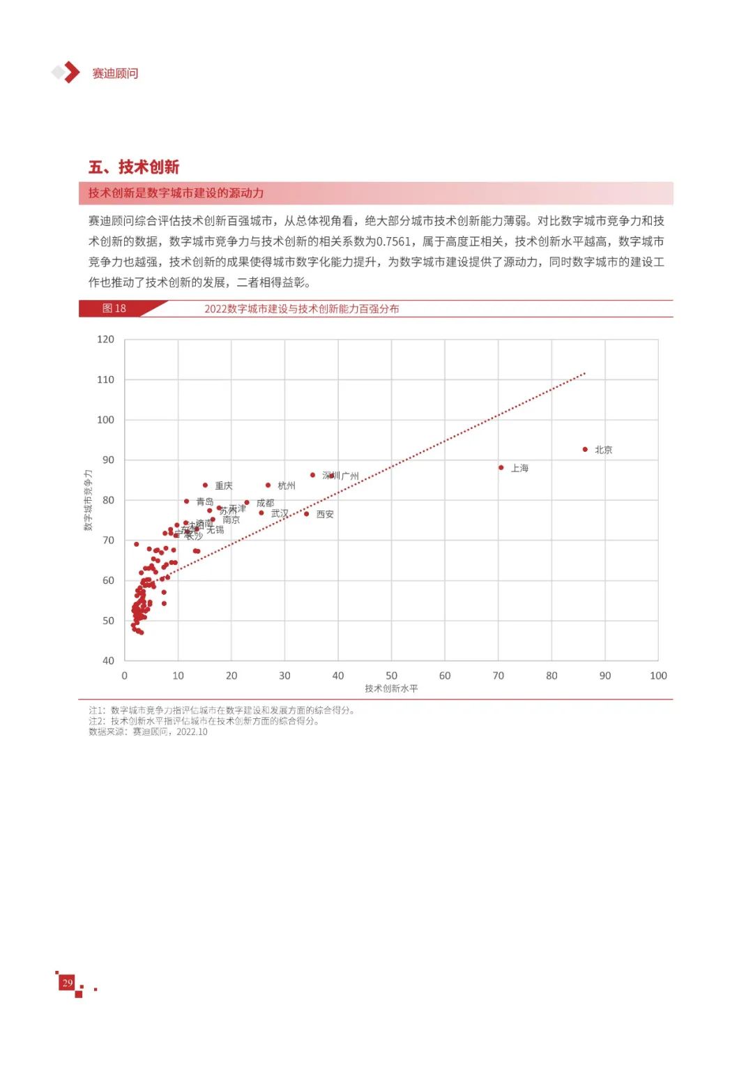 報告主要由四個部分組成,第一部分為數(shù)字城市建設新時期的背景和機遇;第二部分為全國數(shù)字城市競爭力評價的指標體系、百強榜單和百強城市特征分析;第三部分為數(shù)字城市能力解碼,從信息基礎、城市治理、民生服務、技術(shù)創(chuàng)新、低碳發(fā)展等方面分別闡述了城市各領(lǐng)域數(shù)字化水平;第四部分為數(shù)字城市建設典型實踐,挑選各領(lǐng)域建設的典型城市進行案例分析。