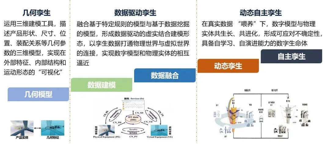 數字孿生是尚處于發(fā)展進程中的方法體系,數字孿生應用也存在不同的成熟度等級。當前應用最廣的是幾何孿生,如在數字孿生城市、數字孿生工廠中運用三維建模工具,描述產品形狀、尺寸、位置、裝配關系等幾何參數,實現“以虛仿實”;在幾何孿生之上,融合數據與規(guī)則,構建具備較為完整的運動和控制邏輯的模型,接收物理世界的真實數據,實現“以虛控實”;通過數據驅動數字模型與物理實體共生長、共進化,形成可應對不確定性的,具備自學習、自演進能力的數字生命體,“以虛預實”、“以虛優(yōu)實”,最終達到自主動態(tài)孿生的理想狀態(tài),實現“虛實共生”。