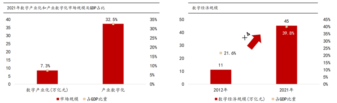 數(shù)字經(jīng)濟(jì)規(guī)??焖僭鲩L。2021年,我國數(shù)字產(chǎn)業(yè)化規(guī)模和產(chǎn)業(yè)數(shù)字化規(guī)模分別為8.35、37.18萬億元。從2012年至2021年,我國數(shù)字經(jīng)濟(jì)規(guī)模從11萬億元增長到超45萬億元,數(shù)字經(jīng)濟(jì)占國內(nèi)生產(chǎn)總值比重由21.6%提升至39.8%。