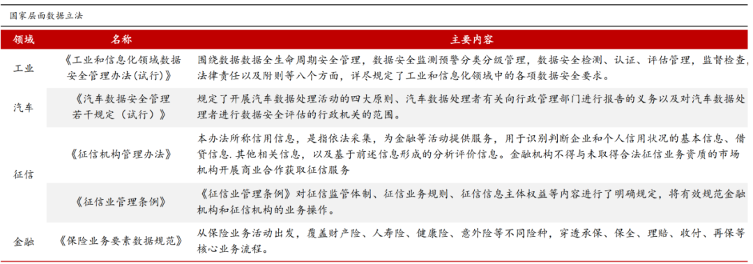 行業(yè)層面:多部委出臺行業(yè)基礎(chǔ)性數(shù)據(jù)規(guī)范和指導(dǎo)性文件。針對工業(yè)、電信、汽車、征信業(yè)、金融等行業(yè)數(shù)據(jù)發(fā)布規(guī)范和指導(dǎo)性文件,從關(guān)鍵信息基礎(chǔ)設(shè)施保護(hù)、數(shù)據(jù)跨境、數(shù)據(jù)壟斷、數(shù)據(jù)技術(shù)等層面著手,為保護(hù)公民信息、保障國家安全提供保障。