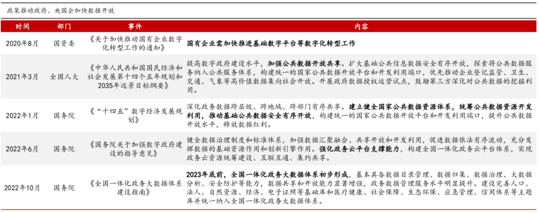 其二:政策推動下,政府、央國企有望發(fā)揮引領(lǐng)作用,加速數(shù)據(jù)開放,實現(xiàn)率先上云。