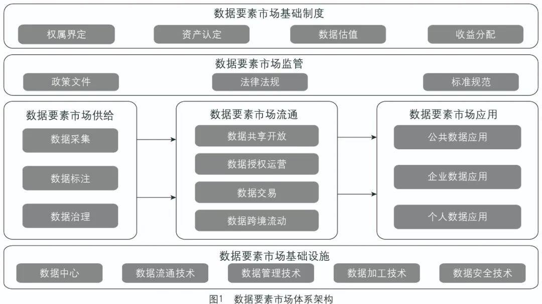 數(shù)據(jù)要素市場體系包括基礎(chǔ)制度、市場供給、市場流通、市場應(yīng)用、市場監(jiān)管、市場基礎(chǔ)設(shè)施等(參見圖1)。