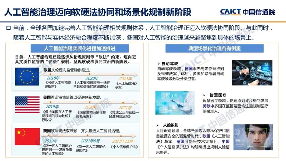 4、人工智能治理邁入軟硬法協(xié)同和場景規(guī)制新階段。人工智能治理實質(zhì)化進(jìn)程加速推進(jìn),各國人工智能治理側(cè)重各有不同,但整體上呈現(xiàn)加速演進(jìn)態(tài)勢,即從初期構(gòu)建以“軟法”為導(dǎo)向的社會規(guī)范體系,開始推進(jìn)以“硬法”為保障的風(fēng)險防控體系。典型場景化治理加速落地,各國紛紛注意到人工智能應(yīng)用場景多樣化和差異化給治理帶來的復(fù)雜性,典型場景的治理成為各國的工作重點,特別聚焦于自動駕駛、智慧醫(yī)療和人臉識別等領(lǐng)域。