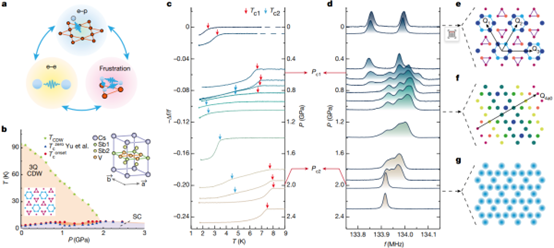 圖1.籠目超導(dǎo)體CsV3Sb5中電荷密度波態(tài)與超導(dǎo)態(tài)在靜水壓下演化的實(shí)驗(yàn)證據(jù)以及物理演示圖
