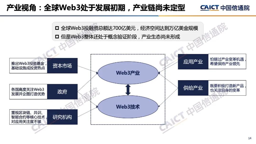 6. 在產(chǎn)業(yè)視角,Web3創(chuàng)新性的形成了以數(shù)字資產(chǎn)為媒介的經(jīng)濟空間,但全球Web3產(chǎn)業(yè)尚未形成穩(wěn)定的規(guī)模和成熟的模式。多國政府均對Web3發(fā)展高度關(guān)注并保持積極探索,標準化組織正在圍繞分布式標識、數(shù)字資產(chǎn)等重點方向開展技術(shù)研究與標準制定,Web3投融資規(guī)模與數(shù)量均保持持續(xù)增長,互聯(lián)網(wǎng)企業(yè)與來自其他行業(yè)的企業(yè)都在通過Web3尋找新的產(chǎn)業(yè)機遇。