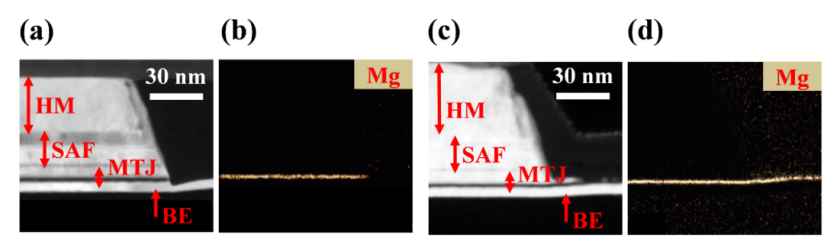 (c)“停MgO”器件TEM圖,(d)“停MgO”器件EDS圖