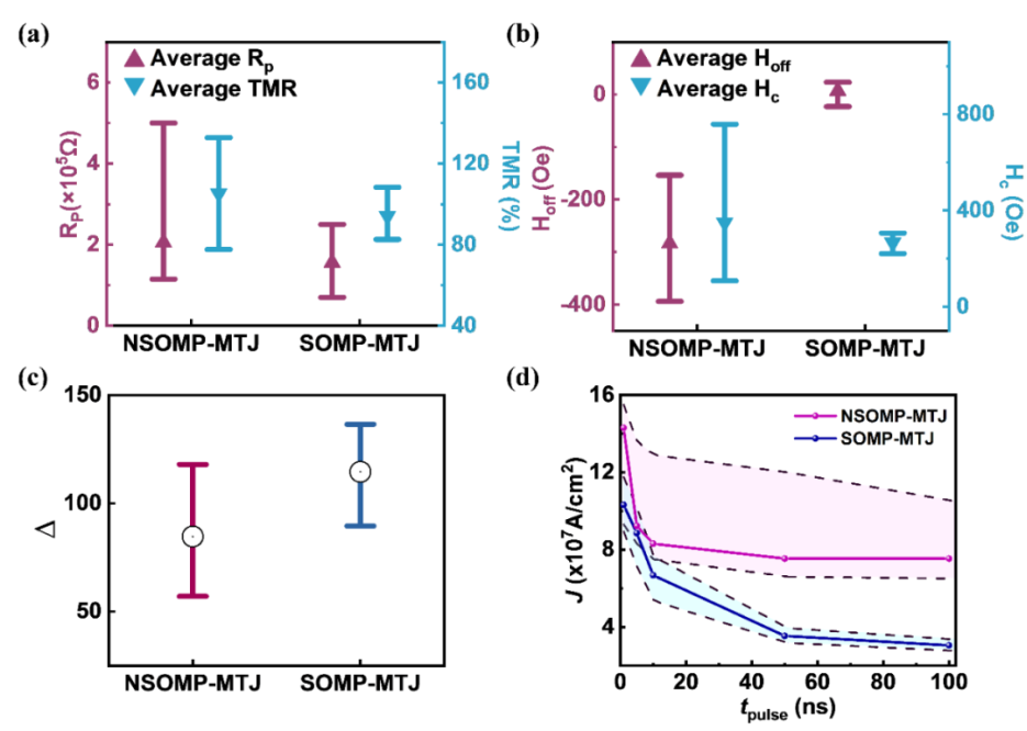 為了更好地解決SOT-MRAM的刻蝕技術(shù)難題以實(shí)現(xiàn)SOT-MTJ的高密度片上集成,同時(shí)研究不同的刻蝕工藝對器件磁電特性的影響,中國科學(xué)院微電子研究所集成電路先導(dǎo)工藝研發(fā)中心羅軍研究員課題組開發(fā)了一種基于垂直磁各向異性SOT-MTJ的刻蝕“停MgO”工藝(SOMP-MTJ),該工藝有效地解決了SOT-MRAM制造中的刻蝕短路問題。傳統(tǒng)的SOT-MTJ刻蝕方法(NSOMP-MTJ)使刻蝕停止在底電極上(圖1a,b),在刻蝕過程中MgO層極易附著金屬,造成器件短路。課題組開發(fā)了刻蝕“停MgO”工藝,該工藝使MTJ刻蝕終點(diǎn)精確地停止在~1 nm厚的MgO層上(圖 1c,d)。由于隧穿層MgO的側(cè)壁從未暴露,從而避免了MgO層的短路。利用“停MgO”刻蝕工藝制備的SOT-MTJ器件陣列,晶圓的電阻良率可提升至100%,同時(shí)還提高了器件的TMR、電阻、矯頑力等關(guān)鍵參數(shù)的均勻性(圖 2a,b)。另外,“停MgO”器件還具有更高的熱穩(wěn)定性、更低的翻轉(zhuǎn)電流密度以及高達(dá)1 ns的翻轉(zhuǎn)速度(圖 2c,d)。該研究成果為高速、低功耗、高集成度SOT-MRAM的刻蝕技術(shù)問題提供了關(guān)鍵解決方案。