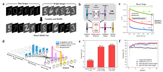 圖2 a)混合光強MNIST手寫數(shù)字?jǐn)?shù)據(jù)集示意圖;b)具有水平調(diào)制(HM)網(wǎng)絡(luò)模塊的延進(jìn)儲池的視覺自適應(yīng)工作流程;c)柵壓調(diào)制下器件動力學(xué)響應(yīng)過程;d)光電自適應(yīng)延時儲池計算過程示意圖;e)基準(zhǔn)網(wǎng)絡(luò)(左)、小調(diào)制范圍網(wǎng)絡(luò)(中)和大調(diào)制范圍網(wǎng)絡(luò)(右)識別率;f)初始儲池網(wǎng)絡(luò)(黑)、小調(diào)制范圍網(wǎng)絡(luò)(藍(lán))和大調(diào)制網(wǎng)絡(luò)(紅)的識別率比較