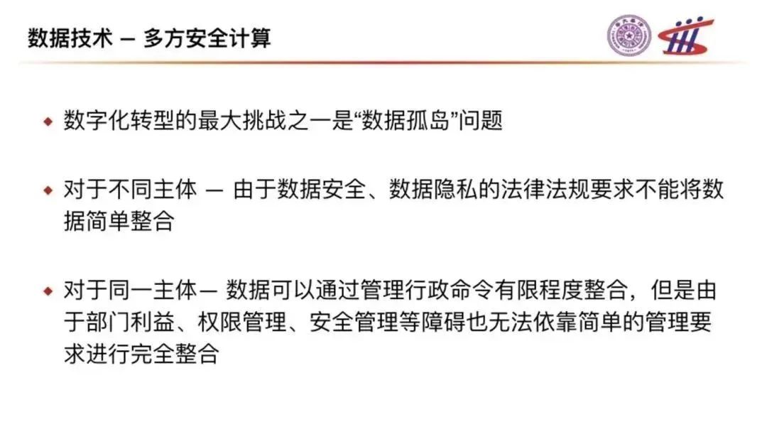 數(shù)字化轉(zhuǎn)型的最大挑戰(zhàn)之一是“數(shù)據(jù)孤島”問題:對于不同主體,由于數(shù)據(jù)安全、數(shù)據(jù)隱私的法律法規(guī)要求不能將數(shù)據(jù)簡單整合;對于同一主體,數(shù)據(jù)可以通過管理行政命令有限程度整合,但是由于部門利益、權(quán)限管理、安全管理等障礙也無法依靠簡單的管理要求進(jìn)行完全整合。
