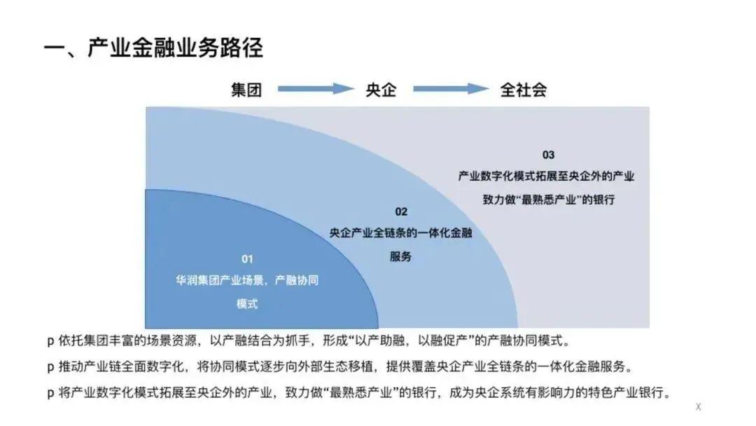 從路徑上講,華潤集團(tuán)有豐富的場景資源,可以用產(chǎn)融結(jié)合為抓手,形成“以產(chǎn)助融,以融促產(chǎn)”的產(chǎn)融協(xié)同模式。并推動產(chǎn)業(yè)鏈全面數(shù)字化,將協(xié)同模式逐步向外部生態(tài)移植。