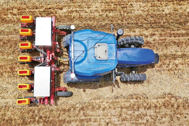 在河南省鄧州市小楊營(yíng)鎮(zhèn)安眾村,加裝有北斗導(dǎo)航系統(tǒng)的拖拉機(jī)在無(wú)人駕駛狀態(tài)下播種。