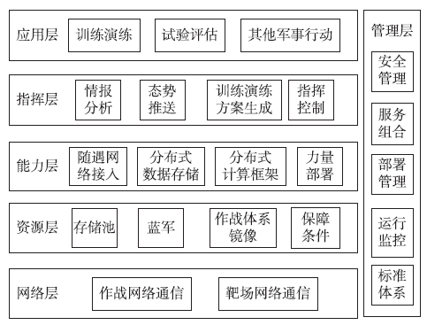 5)智能決策層:將作戰(zhàn)規(guī)則、專家經(jīng)驗等數(shù)字化,存入知識庫,通過對敵我雙方態(tài)勢的推理和推演提供作戰(zhàn)指揮輔助決策、演練方案評估、作戰(zhàn)效能評估、決策效能質(zhì)量評估等功能。