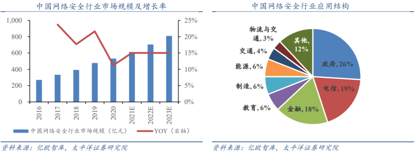 信創(chuàng)背景下網(wǎng)絡(luò)安全在行業(yè)領(lǐng)域發(fā)展或?qū)⑻崴?,整體呈現(xiàn)重硬件輕軟件趨勢。在“十四五”和二零三五的整體規(guī)劃下,以及部分違法處理個(gè)人信息事件的發(fā)生,使得網(wǎng)絡(luò)安全的重要性提升。網(wǎng)絡(luò)安全領(lǐng)域,硬件和軟件產(chǎn)品均有垂直廠商布局,“雙輪驅(qū)動(dòng)”布局優(yōu)勢明顯,2022 年我國網(wǎng)絡(luò)安全行業(yè)市場規(guī)模約為700 億元左右。根據(jù)億歐統(tǒng)計(jì)數(shù)據(jù),政府端網(wǎng)絡(luò)安全產(chǎn)品滲透率已超過 1/4,電信、金融領(lǐng)域?qū)⒔?1/5,其他行業(yè)領(lǐng)域網(wǎng)絡(luò)安全仍有較大發(fā)展空間。