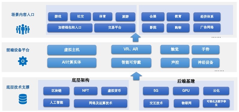 首先,提供元宇宙體驗(yàn)的硬件入口(VR/AR/MR/腦機(jī)接口)及操作系統(tǒng),其次是支持元宇宙平穩(wěn)運(yùn)行的后端基建(5G/算力與算法/云計(jì)算/邊緣計(jì)算)與底層架構(gòu)(引擎/開發(fā)工具/數(shù)字孿生/區(qū)塊鏈),再次是元宇宙中的核心生產(chǎn)要素(人工智能),最終呈現(xiàn)為百花齊放的內(nèi)容與場(chǎng)景,以及元宇宙生態(tài)繁榮過程中涌現(xiàn)的大量提供技術(shù)與服務(wù)的協(xié)同方。